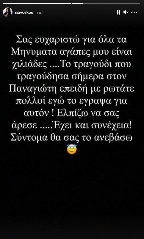 «Σας ευχαριστώ για όλα τα μηνύματα αγάπες μου, είναι χιλιάδες… Το τραγούδι που ερμήνευσα σήμερα στον Παναγιώτη επειδή με ρωτάτε πολλοί εγώ το έγραψα για αυτόν. Ελπίζω να σας άρεσε. Έχει και συνέχεια! Σύντομα θα σας το ανεβάσω», έγραψε χαρακτηριστικά η Σία Βοσκανίδου.