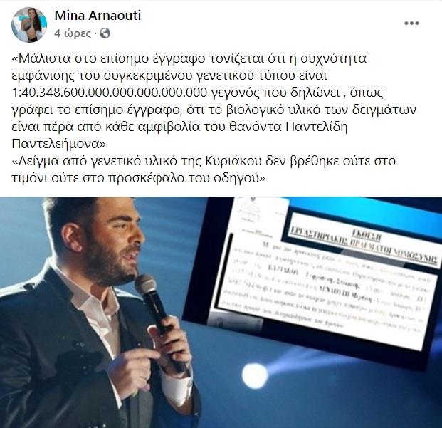Η νεαρή κοπέλα δημοσίευσε ένα άρθρο των Ελληνικών Hoaxes και σημείωσε τις δύο αυτές προτάσεις από το κείμενο του site: «Μάλιστα στο επίσημο έγγραφο τονίζεται ότι η συχνότητα εμφάνισης του συγκεκριμένου γενετικού τύπου είναι 1:40.348.600.000.000.000.000.000 γεγονός που δηλώνει , όπως γράφει το επίσημο έγγραφο, ότι το βιολογικό υλικό των δειγμάτων είναι πέρα από κάθε αμφιβολία του θανόντα Παντελίδη Παντελεήμονα». «Δείγμα από γενετικό υλικό της Κυριάκου δεν βρέθηκε ούτε στο τιμόνι ούτε στο προσκέφαλο του οδηγού»
