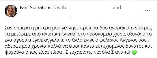 Η Φανή Σωκράτους, συγκινημένη μίλησε για τον αδερφό της Γιάννη και τα γενέθλια του και αφού έστειλε και δημόσια τις ευχές και την μεγάλη της αγάπη, αποκάλυψε πως ο Γιάννης, ο φύλακας άγγελος της, υπό κανονικές συνθήκες δεν θα γιόρταζε μόνος του, αλλά με τον δίδυμο αδερφό του, όπου έγινε αγγελάκι.