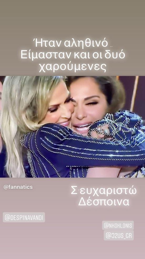 Tα ξημερώματα η Άννα Βίσση δημοσίευσε μια κοινή τους φωτογραφία από τη σφιχτή αγκαλιά που έκαναν γράφοντας: «Ήταν αληθινό και είμαστε και οι δυο χαρούμενες! Σ΄ευχαριστώ Δέσποινα» έγραψε η Aπόλυτη ελληνίδα star κάτω από την φωτογραφία τους!