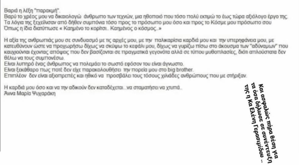 Η αξία της ανθρωπιάς μου σε συνδυασμό με τις αρχές μου, με την παλικαρίσια καρδιά κι υπερηφάνεια μου, με κατευθύνουν ώστε να προχωρήσω δίχως να σκύψω το κεφάλι μου, δίχως να γυρίζω πίσω στο άκουσμα των «αδύναμων» που καυχιούνται έχοντας απόψεις που δεν βασίζονται σε πραγματικά γεγονότα αλλά σε τύπου μυθοπλασίες, διότι απλούστατα δεν θέλω να τους συμπονέσω. Είναι λυπηρό ένας άνθρωπος να πολεμά το σωστό εφόσον του είναι άγνωστο. Είναι ξεκάθαρο πως ποτέ δεν είχε παρακολουθήσει την πορεία μου στο Big Brother. Επιπλέον δεν είναι αξιοπρεπές κι ηθικό να προσβάλει τους τόσους χιλιάδες ανθρώπους που με στήριξαν.