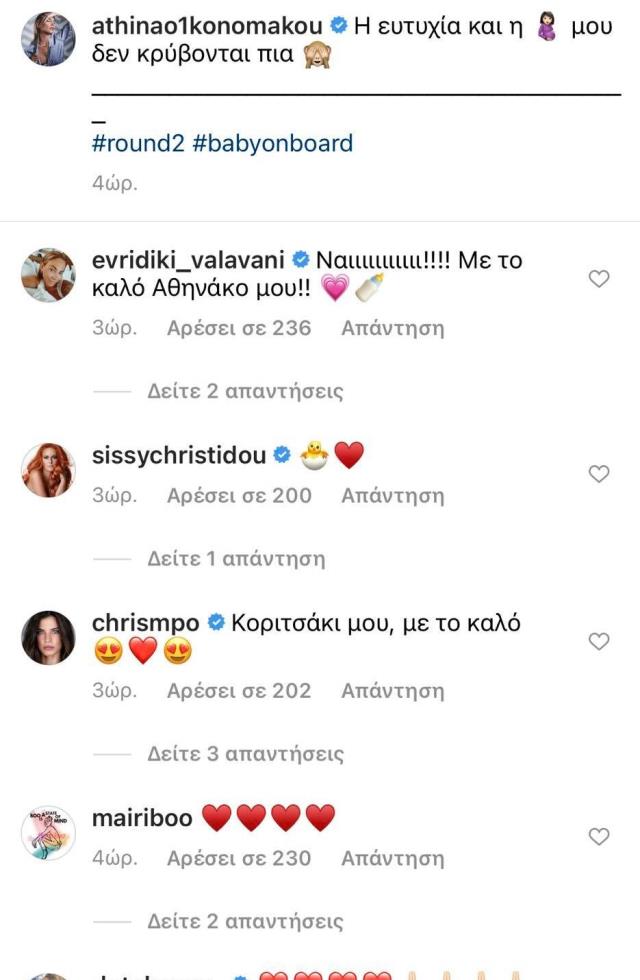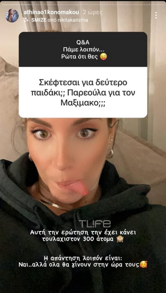Η ηθοποιός αποφάσισε να μην κάνει νωρίς γνωστή την εγκυμοσύνη της για τους ευνόητους λόγους αλλά σήμερα γεμάτη χαρά ανακοίνωσε ότι ο γιος της Μάξιμος  θα αποκτήσει σύντομα ένα αδελφάκι! Δυο ώρες πριν την ανάρτησή της η Αθηνά μας είχε προϊδεάσει, με ένα στόρι στο οποίο φαίνεται να κάνει κάτι που δεν μας έχει συνηθίσει!