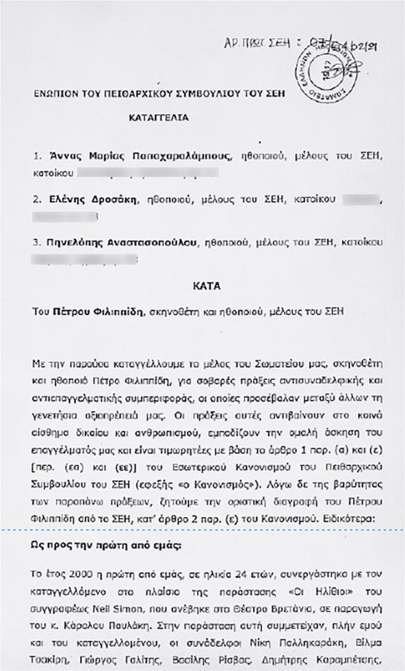Στo «protothema» έφτασε ανώνυμα το κείμενο της κατατεθείσας καταγγελίας των τριών ηθοποιών ενώπιον του Πειθαρχικού του ΣΕΗ, την οποία δημοσιεύουμε αυτούσια, χωρίς οποιαδήποτε δική μας τοποθέτηση, αποκλειστικά και μόνο για λόγους διαφύλαξης του δικαιολογημένου ενδιαφέροντος ενημέρωσης της κοινής γνώμης για το τεράστιο αυτό ζήτημα της τρέχουσας επικαιρότητας. Η καταγραφή περιστατικών καταγγελλόμενης κατάχρησης εξουσίας και φερόμενης επιβολής του επαγγελματικά ισχυρότερου στον καλλιτεχνικό και όχι μόνο χώρο και η ανάδειξη του εξαιρετικά σημαντικού ηθικού ζητήματος που προκύπτει από αυτές εμπίπτουν σαφώς στο καθήκον του Τύπου προς ενημέρωση της κοινής γνώμης.