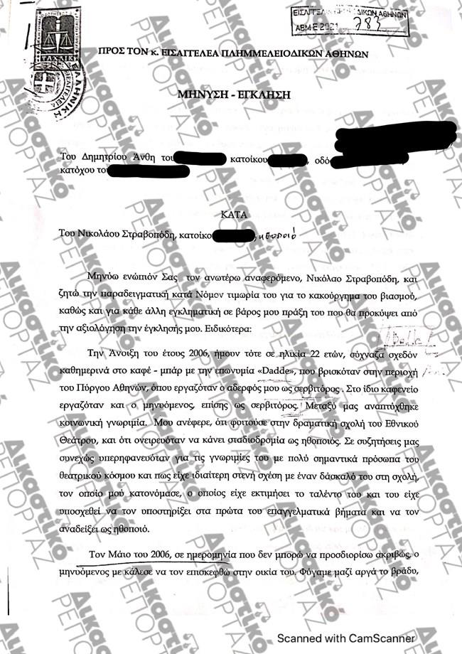 Ο Δημήτρης Άνθης περιέγραψε, σύμφωνα με το dikastikoreportaz.gr την στιγμή της σεξουαλικής του κακοποίησης από τον Νικόλα Στραβοπόδη με τον οποίο και γνωρίστηκε το 2006. Όπως αναφέρει στο δικόγραφο ο ηθοποιός του ανέφερε ότι φοιτούσε στην δραματική σχολή του Εθνικού Θεάτρου, ενώ υπερηφανευόταν για τις γνωριμίες του με πολύ σημαντικά πρόσωπα του θεατρικού κόσμου και πως είχε ιδιαίτερα στενή σχέση με έναν δάσκαλο στη Σχολή (σ.σ. αφήνωντας να εννοηθεί ότι πρόκειται για τον Δημήτρη Λιγνάδη).