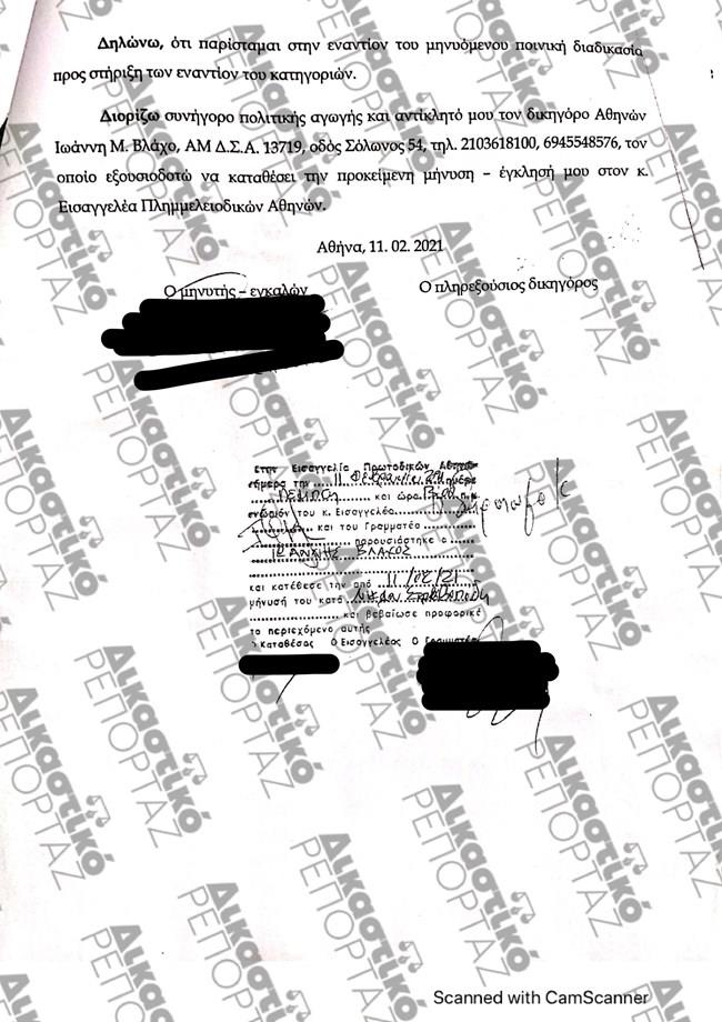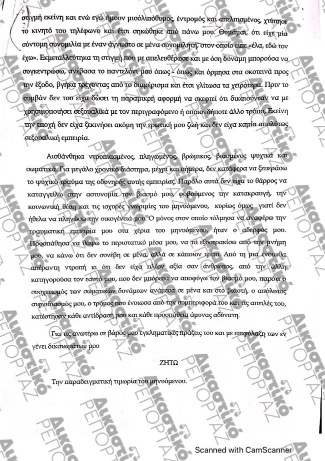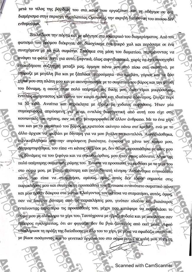 «Χωρίς να έχει προηγηθεί οποιαδήποτε συζήτηση μεταξύ μας, όρμησε πάνω μου από πίσω στα σκοτεινά, με έσπρωξε με μεγάλη βία και με ξάπλωσε μπρούμυτα στο κρεβάτι, γύρισε και τα δύο χέρια του στην πλάτη μου και με ακινητοποίησε με το σωματικό του βάρος και την μυϊκή του δύναμη, η οποία ήταν πολύ υπέρτερη της δικής μου…», αναφέρει.