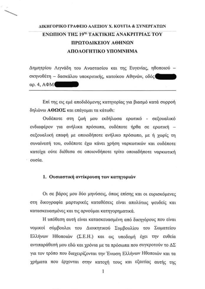 Ο Δημήτρης Λιγνάδης δηλώνει αθώος στο απολογητικό του υπόμνημα, το οποίο παρουσιάζει ολόκληρο το protothema.gr και θα επιχειρεί να αντικρούσει τις κατηγορίες σε βάρος του παρουσιάζοντας τη δική του εκδοχή των δεδομένων.