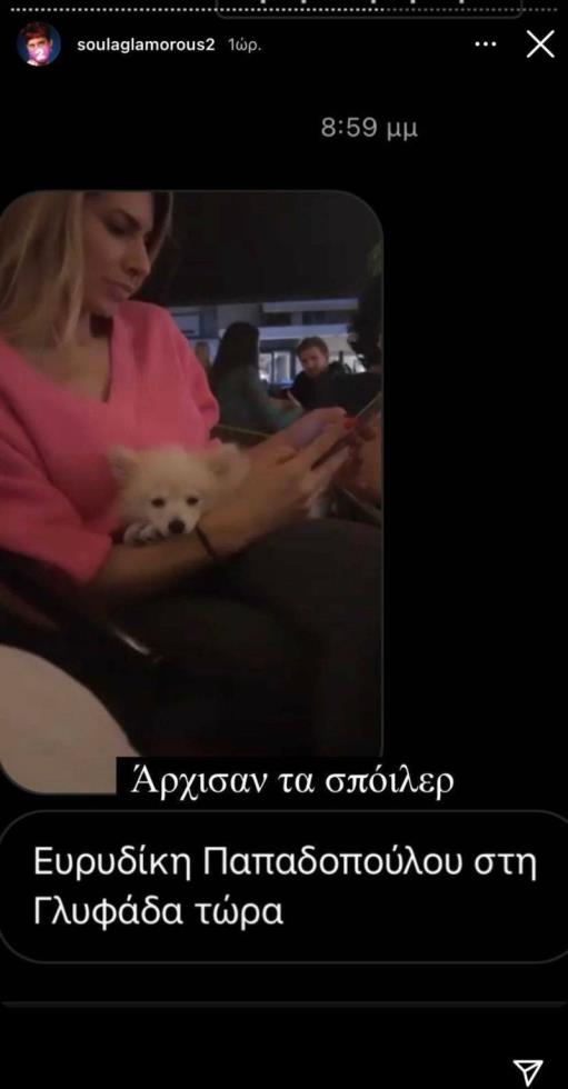 Η περσόνα Soula Glamorous έκανε ένα Insta Story, όπου φαίνεται μία παίκτρια από τους Διάσημους να πίνει καφέ στη Γλυφάδα. Ο λόγος για την Ευρυδίκη Παπαδοπούλου, που έχει κεντρίσει βέβαια το ενδιαφέρον από το πρώτο επεισόδιο.